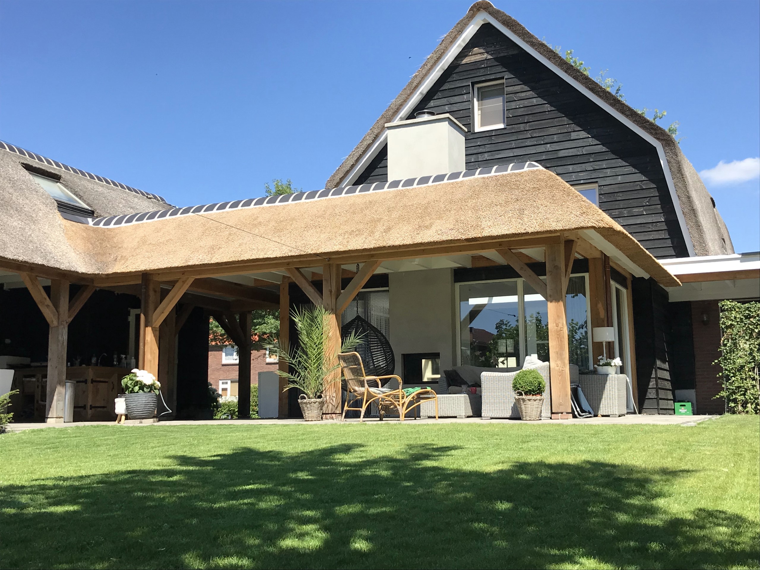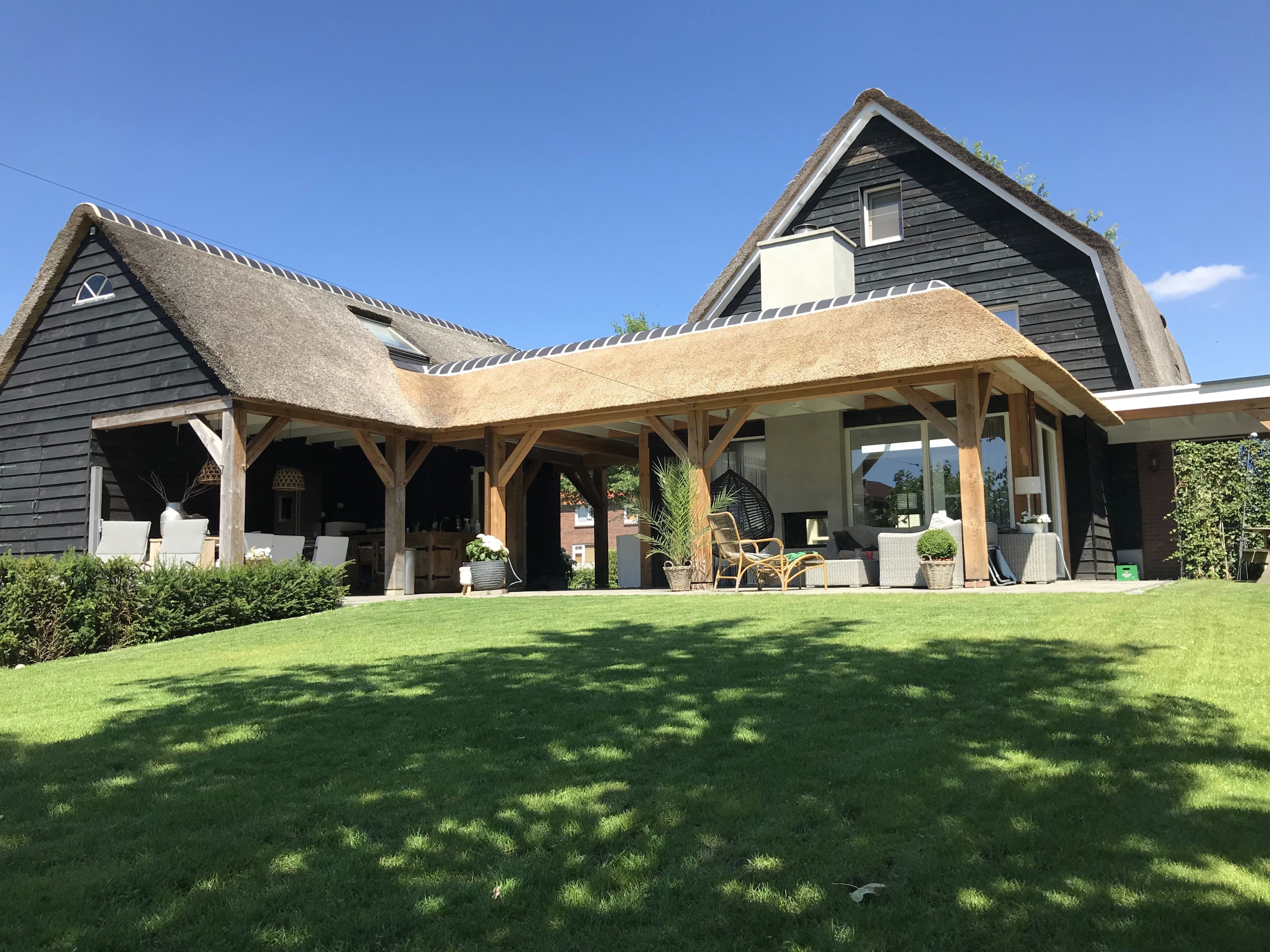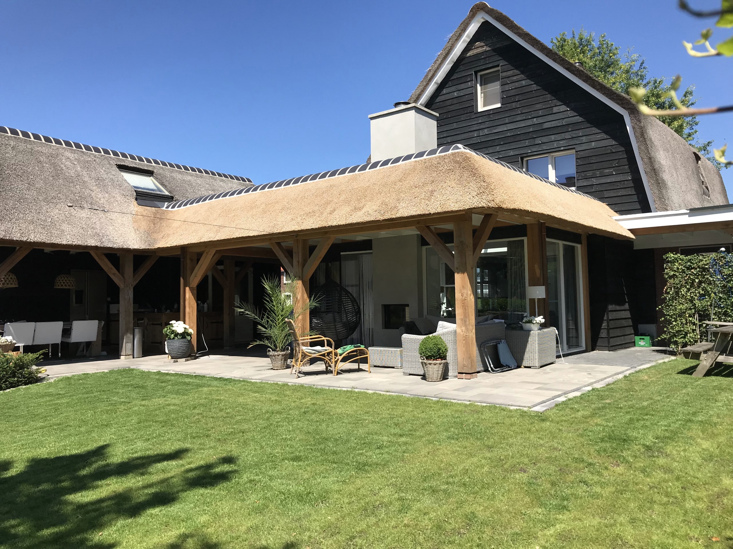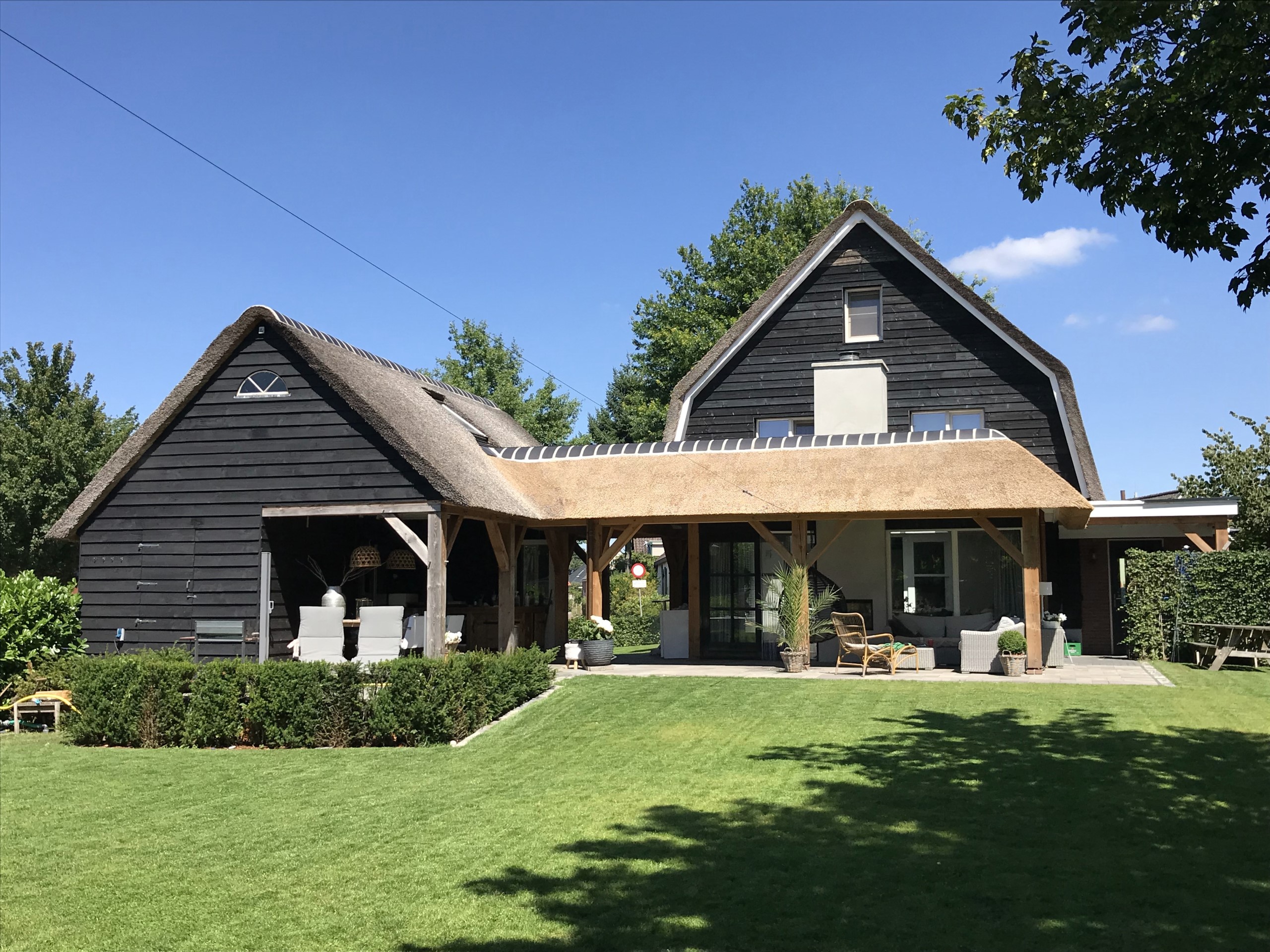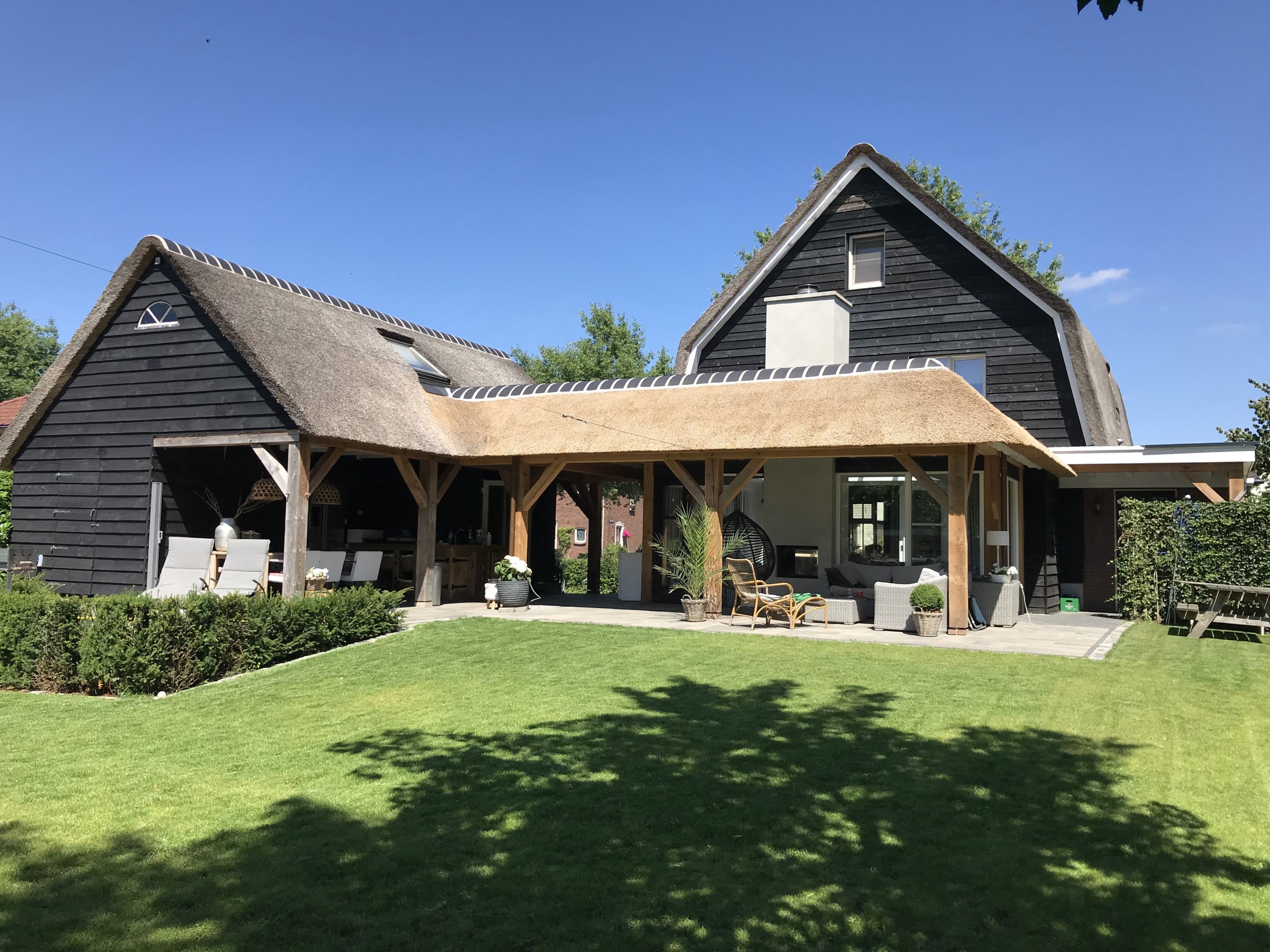 Deze woning is van een pannen dak naar een rietendak gegaan. hierbij hebben we gekozen voor Nederlands riet. Een schitterende breukkap met een mooie overloop van woning naar schuur. De douglas houten palen zorgen ervoor dat het rietendak er nog mooier uitkomt.